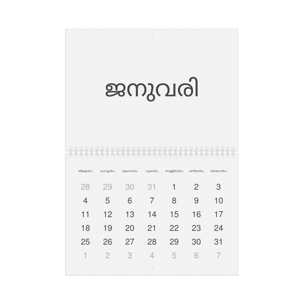 - Linguistics enthusiasts and polyglots - For "language geeks" interested in comparative linguistics or the mechanics of different languages and who value the aesthetic differences in scripts, orthography, and typography of different languages, the Malayalam calendar serves as an object of intellectual interest. You can collect calendars for various languages to compare their linguistic roots (e.g., comparing Romance languages vs. Slavic languages). Leskoff's calendars are characterized by specific typographic choices that highlight the orthography and script unique to the target language. Think correct usage of diacritics, characters, and directional writing (left-to-right vs. right-to-left). The minimalist design focuses on legibility and aesthetic appeal of the script itself.