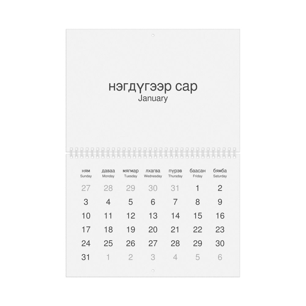 2026 Wall Calendar, Mongolian-Labeled, Sunday-Start Layout, Wire-Bound, 11.7 x 8.3 in (29.7 x 21.0 cm)
