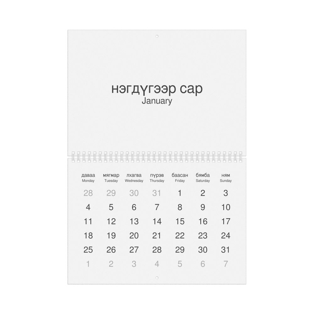 2026 Wall Calendar, Mongolian-Labeled, Monday-Start Layout, Wire-Bound, 11.7 x 8.3 in (29.7 x 21.0 cm)