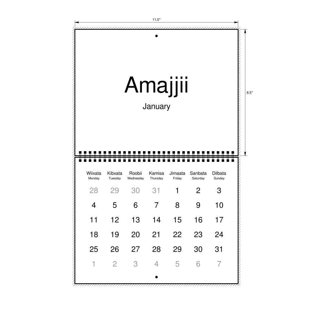 2027 Wall CalendarOromo/English-Labeled, Monday-Start Layout, Wire-Bound, 11 x 8.5 in (27.9 x 21.6 cm)