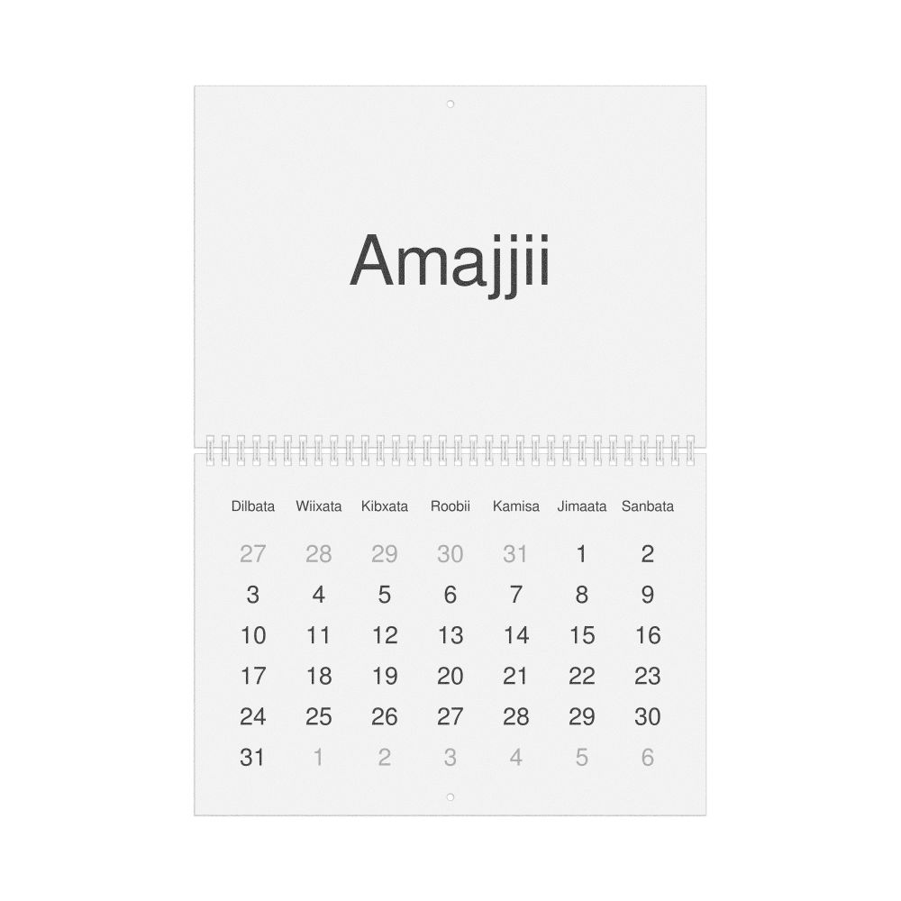 - Oromo heritage speakers and cultural connectors - For individuals seeking to maintain a connection to their history, ancestral roots, or the culture associated with the Oromo language, the calendar serves as a daily cultural marker. Use it in your home, office, library, or museum as a link to linguistic and cultural identity that integrates Oromo into your everyday life. Familiar language script and naming conventions may also provide a sense of home in a foreign environment.
