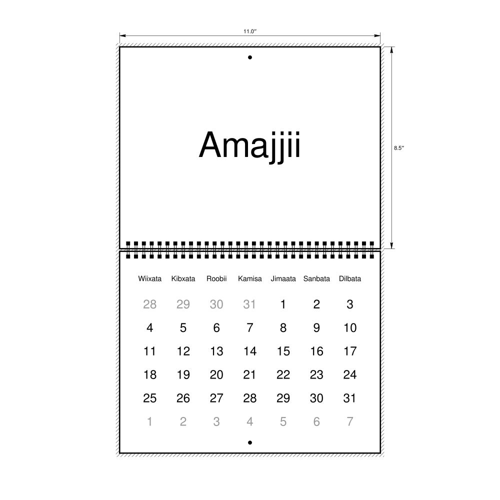 This calendar features the Oromo names of months and days of the week on top of a standard Gregorian calendar layout. Beyond its utility for tracking dates, it serves as an educational tool, cultural touchstone (cultural artifact), and functional decor (aesthetic object).
