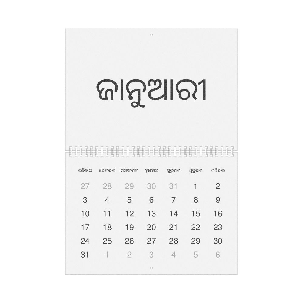 • Linguistics enthusiasts and polyglots - For "language geeks" interested in comparative linguistics or the mechanics of different languages and who value the aesthetic differences in scripts, orthography, and typography of different languages, the Odia calendar serves as an object of intellectual interest. You can collect calendars for various languages to compare their linguistic roots (e.g., comparing Romance languages vs. Slavic languages). Leskoff's calendars are characterized by specific typographic choices that highlight the orthography and script unique to the target language. Think correct usage of diacritics, characters, and directional writing (left-to-right vs. right-to-left). The minimalist design focuses on legibility and aesthetic appeal of the script itself.