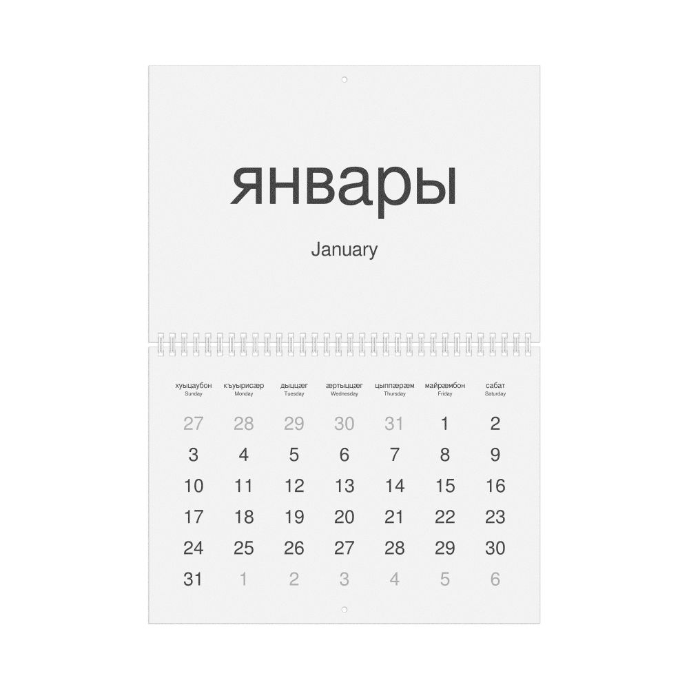 2026 Wall Calendar, Ossetian-Labeled, Sunday-Start Layout, Wire-Bound, 11.7 x 8.3 in (29.7 x 21.0 cm)
