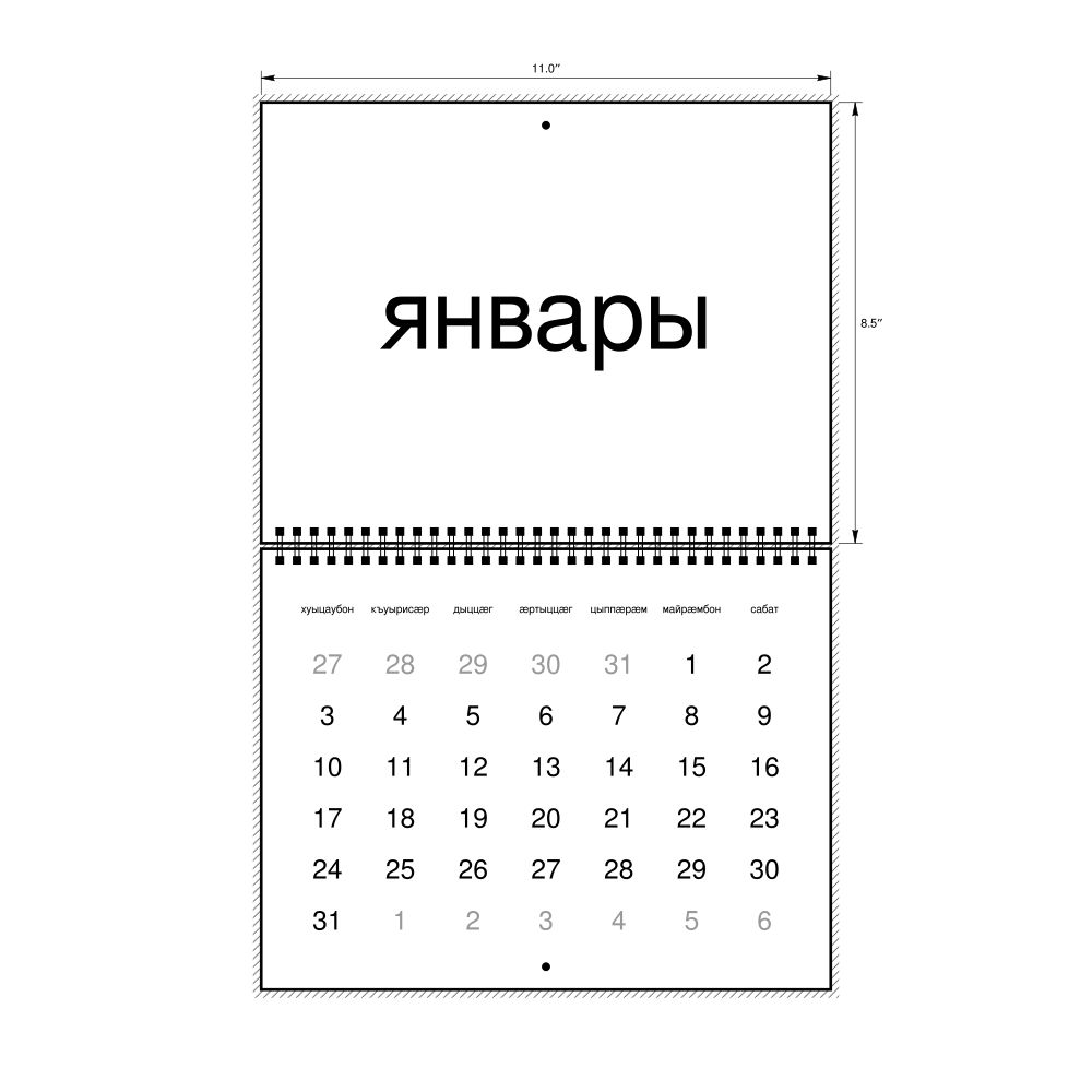 - Linguistics enthusiasts and polyglots - For "language geeks" interested in comparative linguistics or the mechanics of different languages and who value the aesthetic differences in scripts, orthography, and typography of different languages, the Ossetian calendar serves as an object of intellectual interest. You can collect calendars for various languages to compare their linguistic roots (e.g., comparing Romance languages vs. Slavic languages). Leskoff's calendars are characterized by specific typographic choices that highlight the orthography and script unique to the target language. Think correct usage of diacritics, characters, and directional writing (left-to-right vs. right-to-left). The minimalist design focuses on legibility and aesthetic appeal of the script itself.