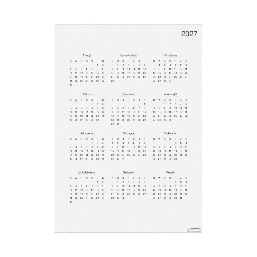- Linguistics enthusiasts and polyglots - For "language geeks" interested in comparative linguistics or the mechanics of different languages and who value the aesthetic differences in scripts, orthography, and typography of different languages, the Oromo calendar serves as an object of intellectual interest. You can collect calendars for various languages to compare their linguistic roots (e.g., comparing Romance languages vs. Slavic languages). Leskoff's calendars are characterized by specific typographic choices that highlight the orthography and script unique to the target language. Think correct usage of diacritics, characters, and directional writing (left-to-right vs. right-to-left). The minimalist design focuses on legibility and aesthetic appeal of the script itself.