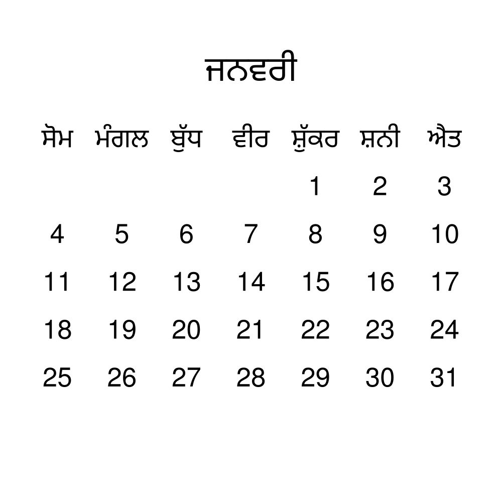 - Punjabi speakers and enthusiasts - Choose this calendar if you are looking for a simple, localized calendar in the Punjabi language. Use it in your home, office, or classroom as a regular calendar.