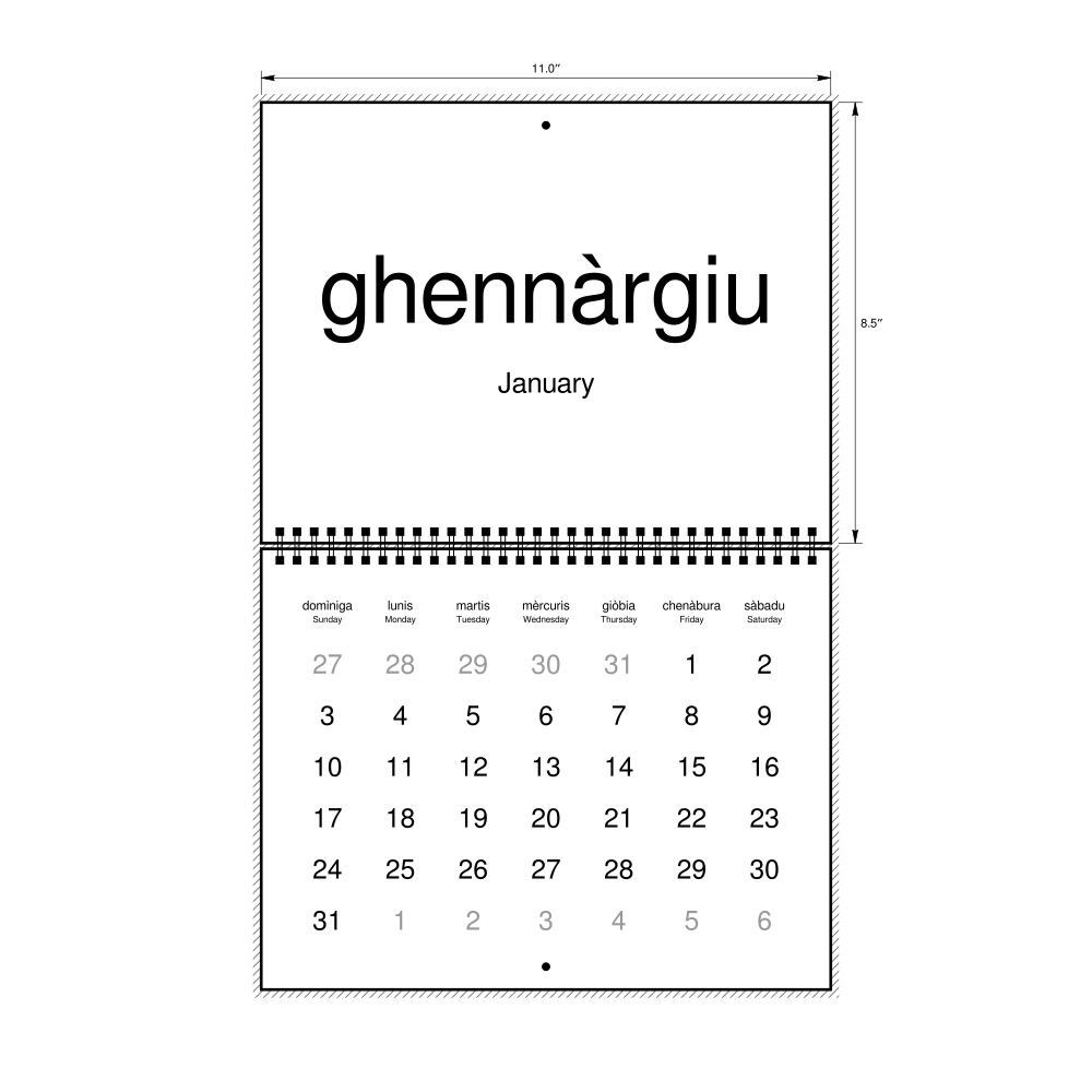 2027 Wall CalendarSardinian/English-Labeled, Sunday-Start Layout, Wire-Bound, 11 x 8.5 in (27.9 x 21.6 cm)