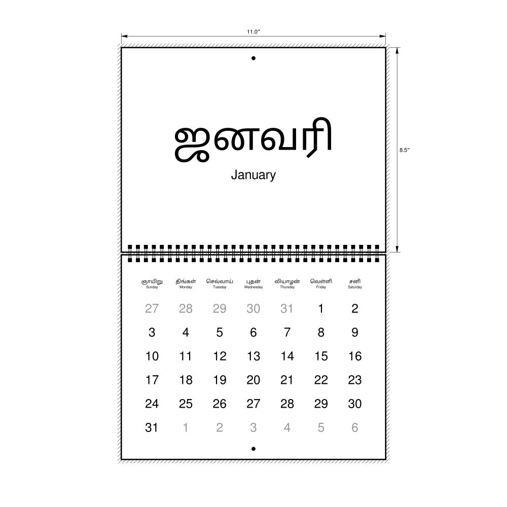2027 Wall CalendarTamil/English-Labeled, Sunday-Start Layout, Wire-Bound, 11 x 8.5 in (27.9 x 21.6 cm)
