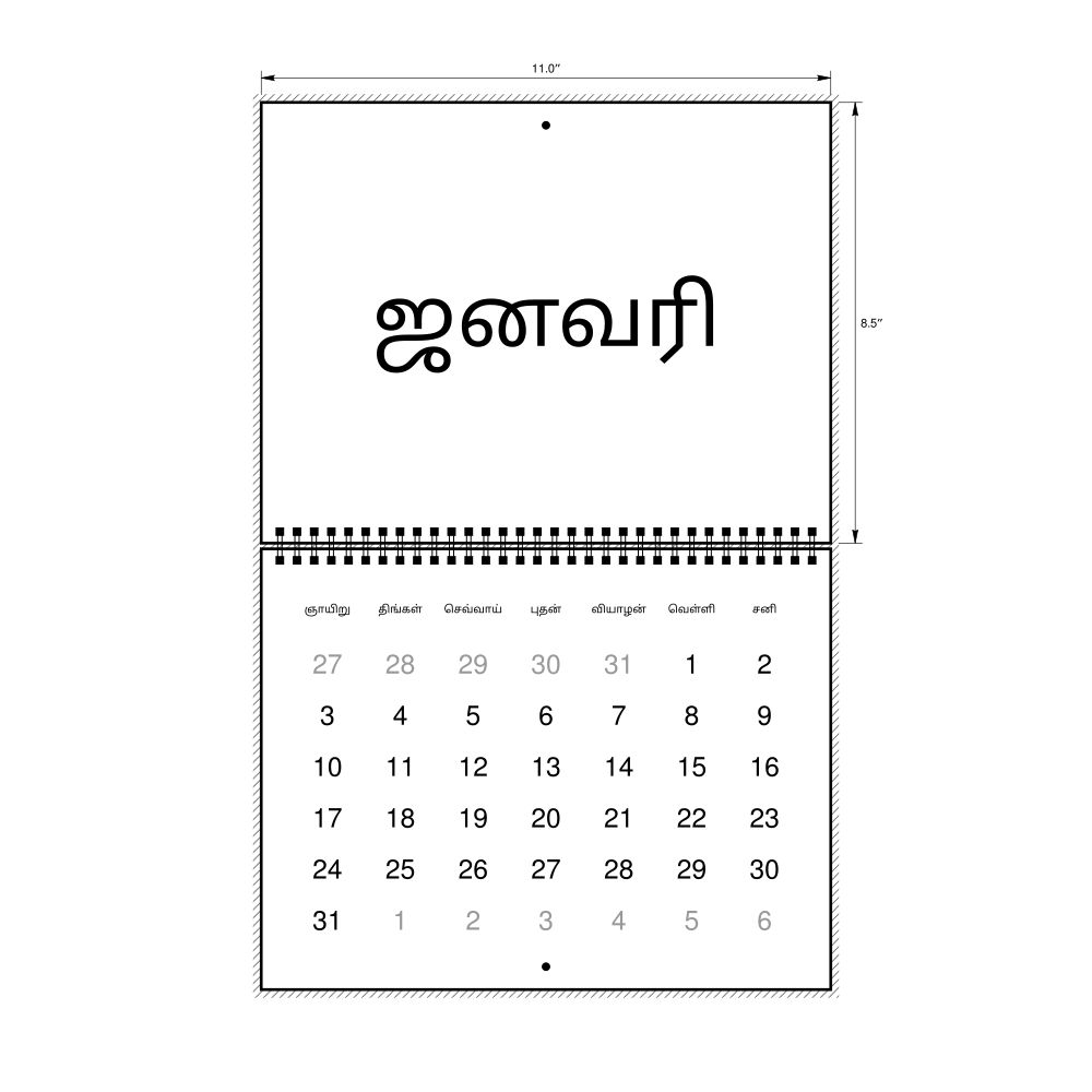 2027 Wall Calendar, Tamil-Labeled, Sunday-Start Layout, Wire-Bound, 11 x 8.5 in (27.9 x 21.6 cm)