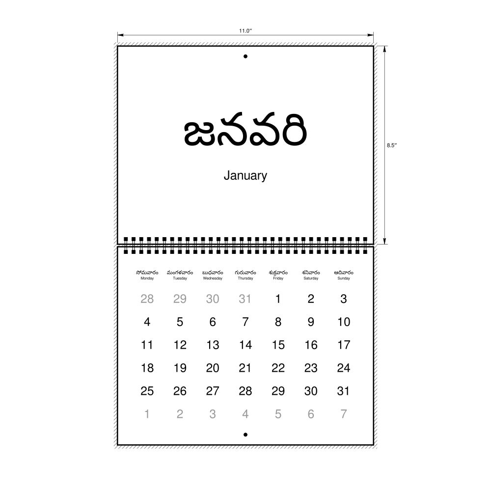 2026 Wall Calendar, Telugu-Labeled, Monday-Start Layout, Wire-Bound, 11 x 8.5 in (27.9 x 21.6 cm)