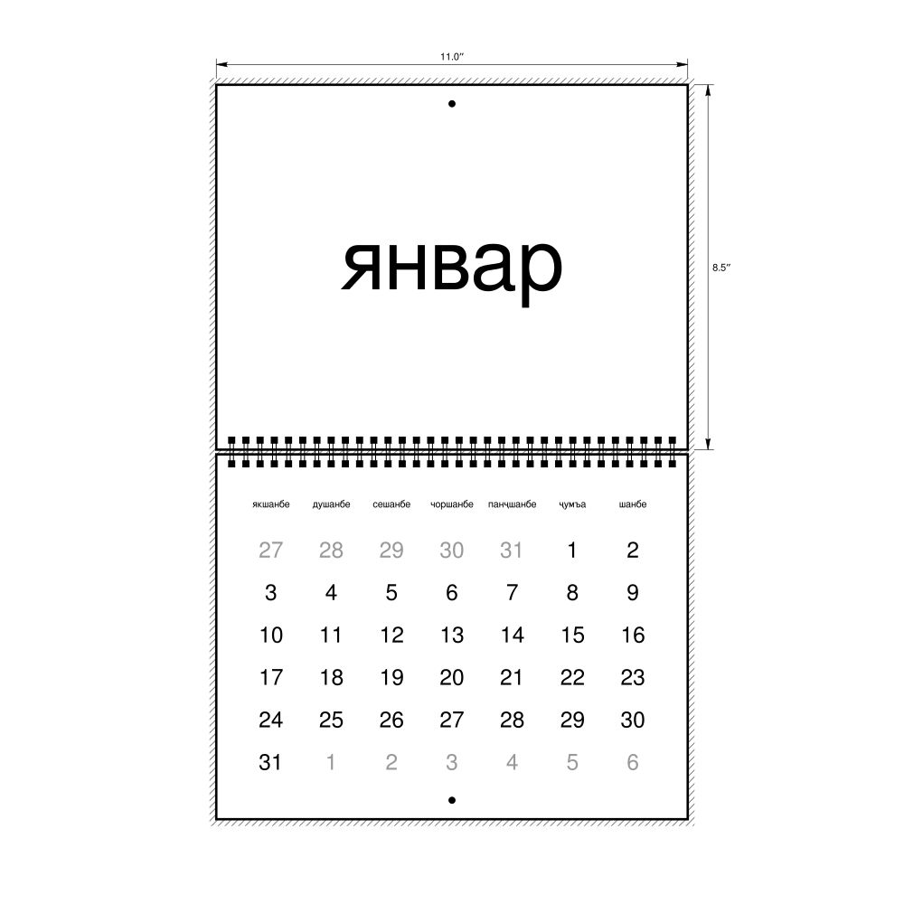 • Linguistics enthusiasts and polyglots - For "language geeks" interested in comparative linguistics or the mechanics of different languages and who value the aesthetic differences in scripts, orthography, and typography of different languages, the Tajik calendar serves as an object of intellectual interest. You can collect calendars for various languages to compare their linguistic roots (e.g., comparing Romance languages vs. Slavic languages). Leskoff's calendars are characterized by specific typographic choices that highlight the orthography and script unique to the target language. Think correct usage of diacritics, characters, and directional writing (left-to-right vs. right-to-left). The minimalist design focuses on legibility and aesthetic appeal of the script itself.