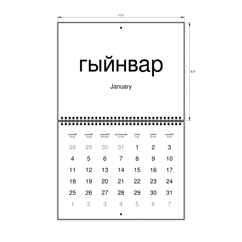 2026 Wall Calendar, Tatar/English-Labeled, Monday-Start Layout, Wire-Bound, 11 x 8.5 in (27.9 x 21.6 cm)