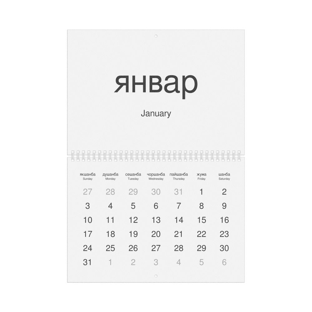 2026 Wall Calendar, Uzbek (Cyrillic)/English-Labeled, Sunday-Start Layout, Wire-Bound, 11.7 x 8.3 in (29.7 x 21.0 cm)