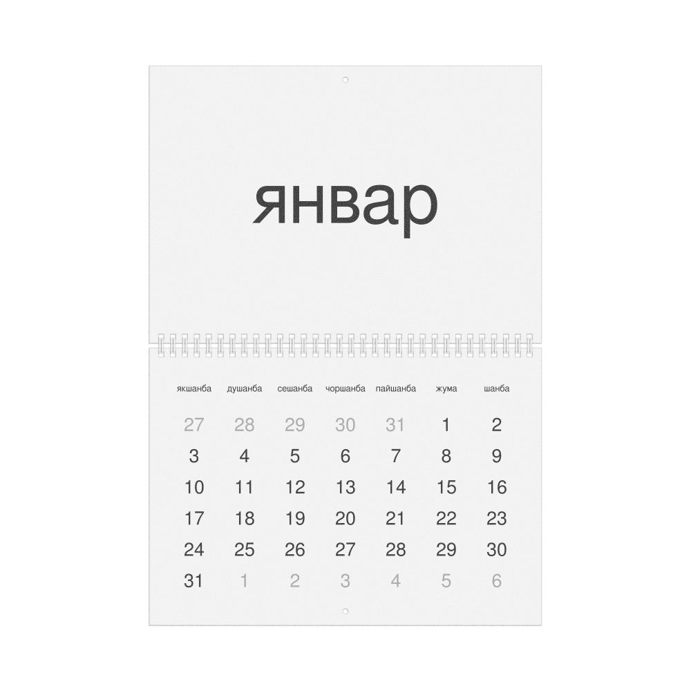 • Linguistics enthusiasts and polyglots - For "language geeks" interested in comparative linguistics or the mechanics of different languages and who value the aesthetic differences in scripts, orthography, and typography of different languages, the Uzbek calendar serves as an object of intellectual interest. You can collect calendars for various languages to compare their linguistic roots (e.g., comparing Romance languages vs. Slavic languages). Leskoff's calendars are characterized by specific typographic choices that highlight the orthography and script unique to the target language. Think correct usage of diacritics, characters, and directional writing (left-to-right vs. right-to-left). The minimalist design focuses on legibility and aesthetic appeal of the script itself.