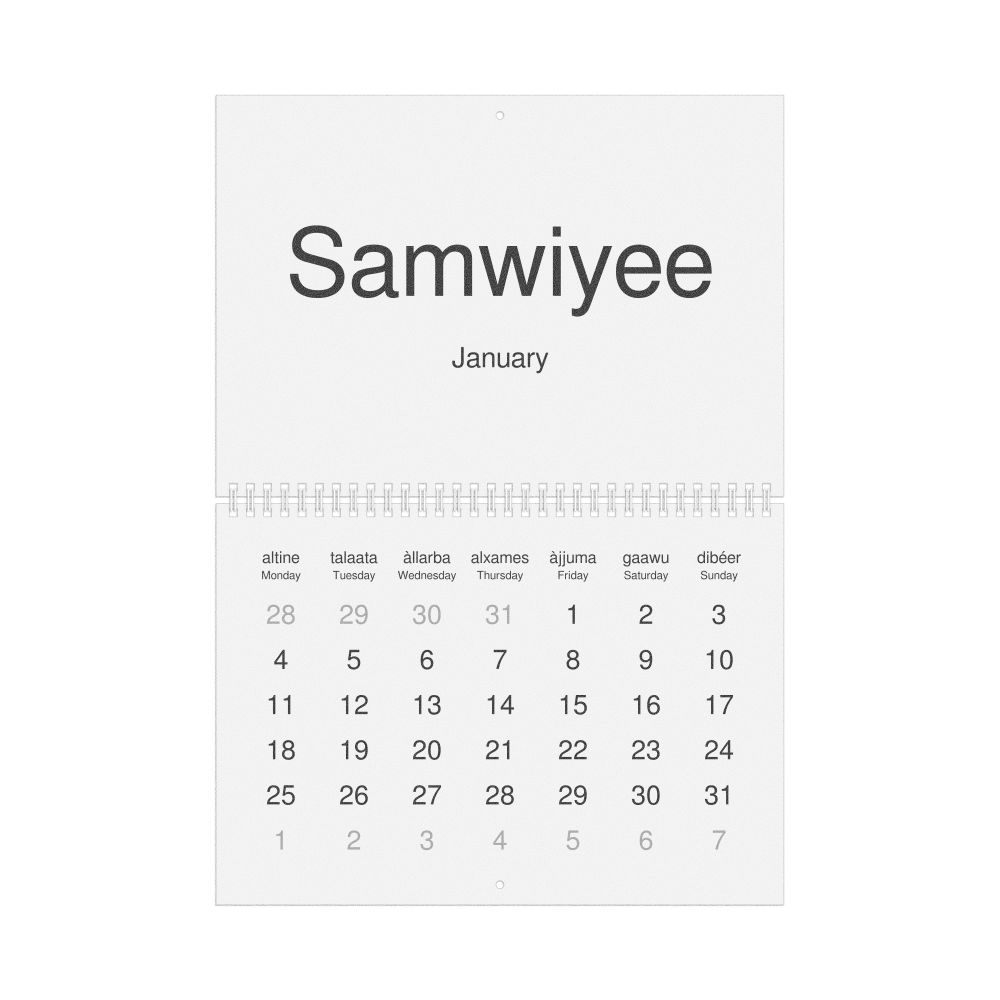 2026 Wall Calendar, Wolof/English-Labeled, Monday-Start Layout, Wire-Bound, 11.7 x 8.3 in (29.7 x 21.0 cm)