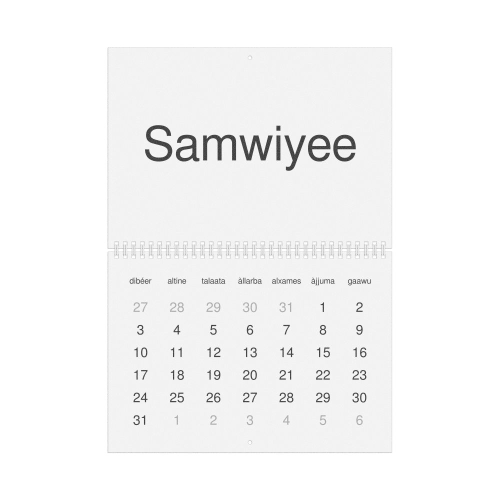 This calendar features the Wolof names of months and days of the week on top of a standard Gregorian calendar layout. Beyond its utility for tracking dates, it serves as an educational tool, cultural touchstone (cultural artifact), and functional decor (aesthetic object).