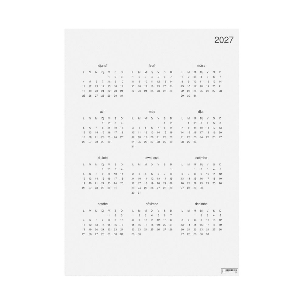 - Linguistics enthusiasts and polyglots - For "language geeks" interested in comparative linguistics or the mechanics of different languages and who value the aesthetic differences in scripts, orthography, and typography of different languages, the Walloon calendar serves as an object of intellectual interest. You can collect calendars for various languages to compare their linguistic roots (e.g., comparing Romance languages vs. Slavic languages). Leskoff's calendars are characterized by specific typographic choices that highlight the orthography and script unique to the target language. Think correct usage of diacritics, characters, and directional writing (left-to-right vs. right-to-left). The minimalist design focuses on legibility and aesthetic appeal of the script itself.