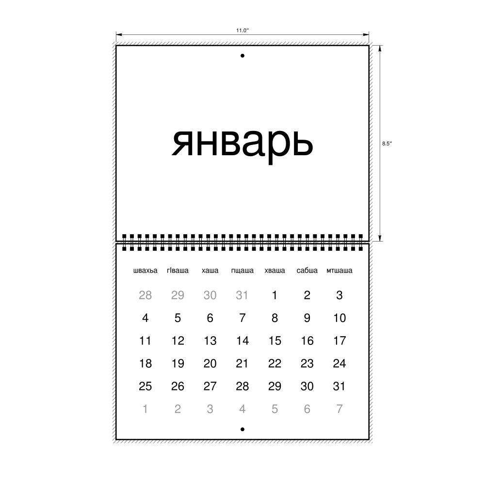 - Linguistics enthusiasts and polyglots - For "language geeks" interested in comparative linguistics or the mechanics of different languages and who value the aesthetic differences in scripts, orthography, and typography of different languages, the Abaza calendar serves as an object of intellectual interest. You can collect calendars for various languages to compare their linguistic roots (e.g., comparing Romance languages vs. Slavic languages). Leskoff's calendars are characterized by specific typographic choices that highlight the orthography and script unique to the target language. Think correct usage of diacritics, characters, and directional writing (left-to-right vs. right-to-left). The minimalist design focuses on legibility and aesthetic appeal of the script itself.