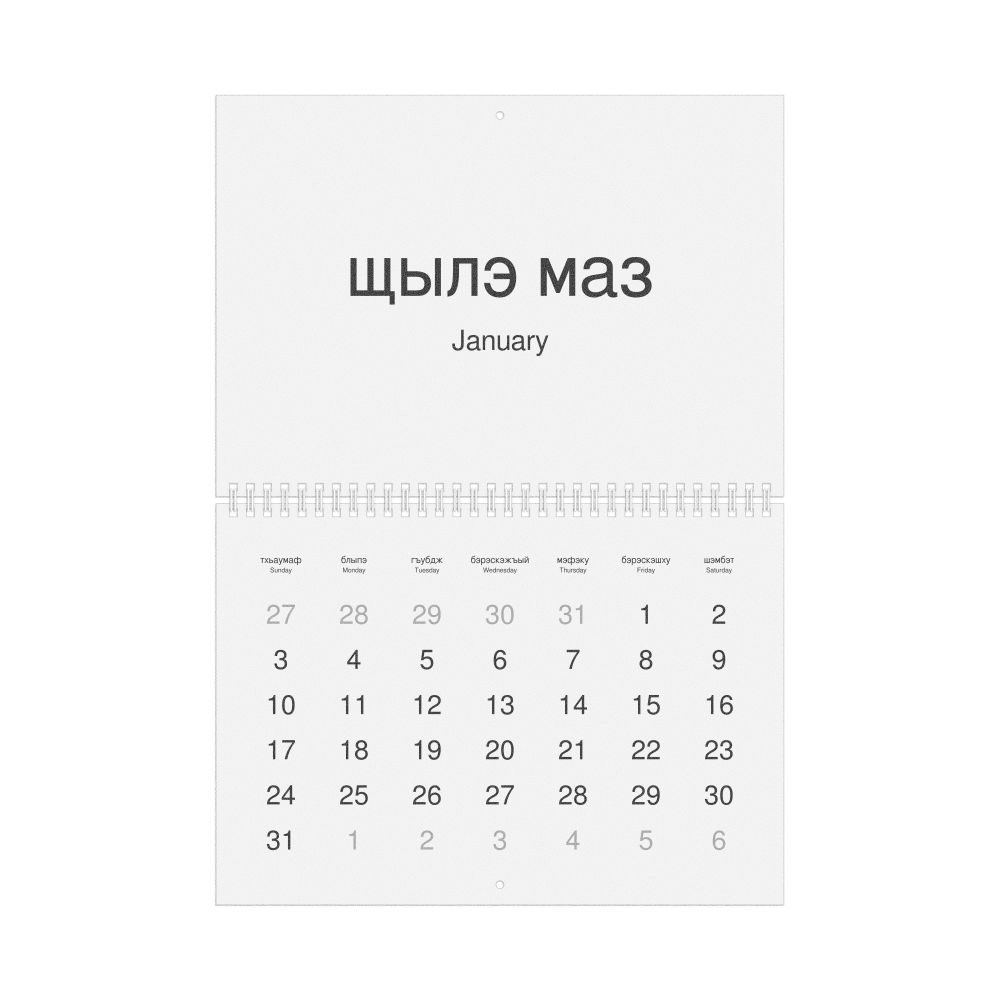 2026 Wall Calendar, Adyghe-Labeled, Sunday-Start Layout, Wire-Bound, 11.7 x 8.3 in (29.7 x 21.0 cm)