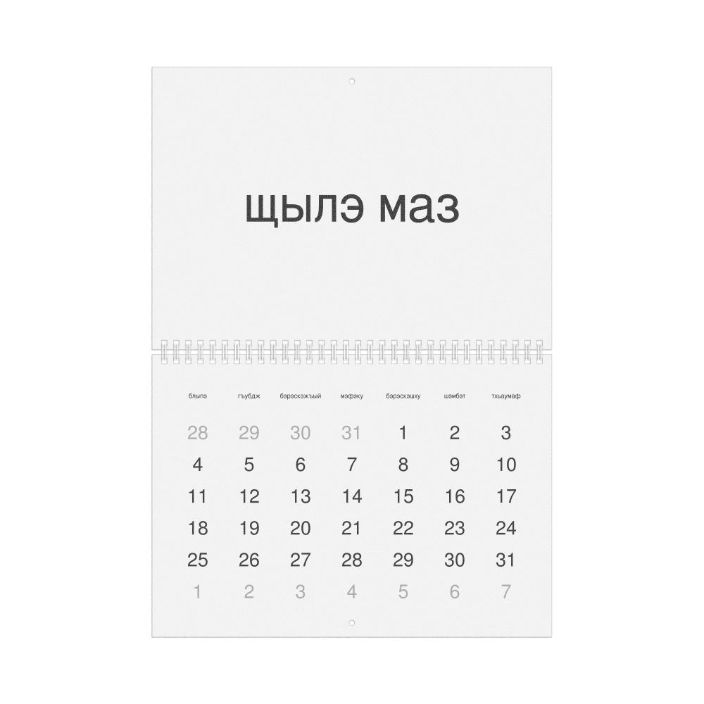 - Linguistics enthusiasts and polyglots - For "language geeks" interested in comparative linguistics or the mechanics of different languages and who value the aesthetic differences in scripts, orthography, and typography of different languages, the Adyghe calendar serves as an object of intellectual interest. You can collect calendars for various languages to compare their linguistic roots (e.g., comparing Romance languages vs. Slavic languages). Leskoff's calendars are characterized by specific typographic choices that highlight the orthography and script unique to the target language. Think correct usage of diacritics, characters, and directional writing (left-to-right vs. right-to-left). The minimalist design focuses on legibility and aesthetic appeal of the script itself.
