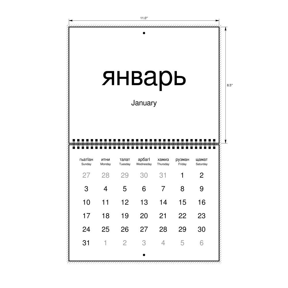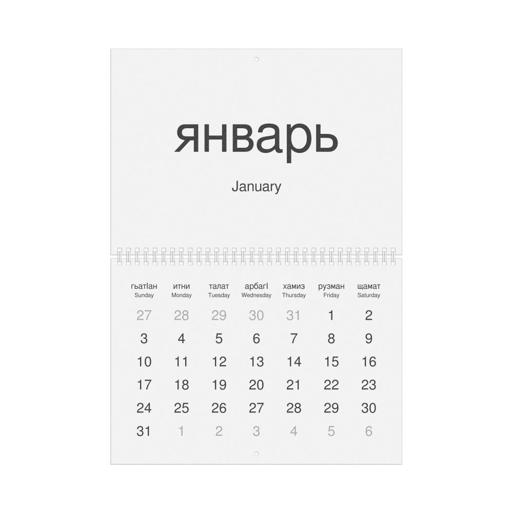 An Avar-language wall calendar (2027, Sunday-start format) with English translations.