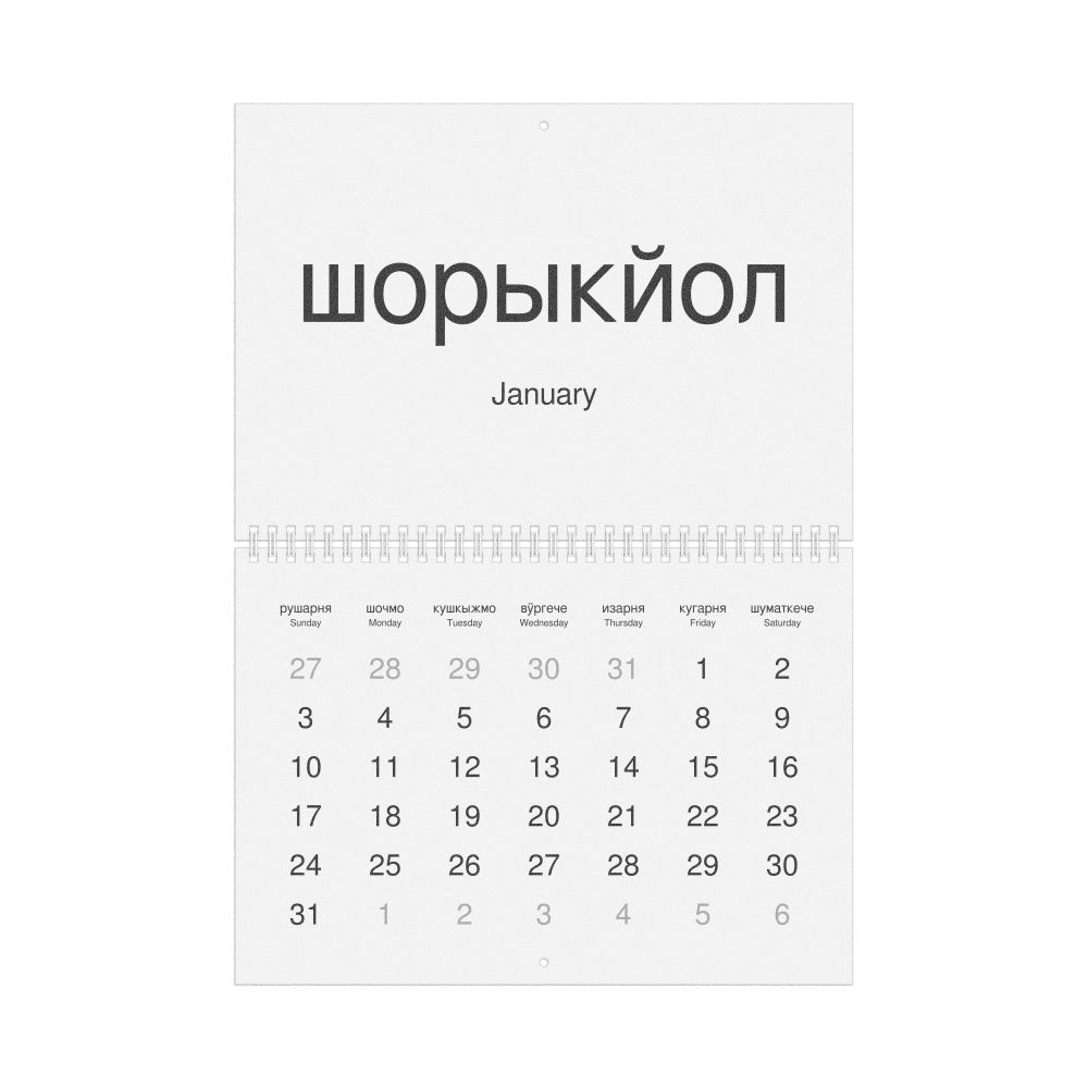 A Mari-language wall calendar (2027, Sunday-start format) with English translations.