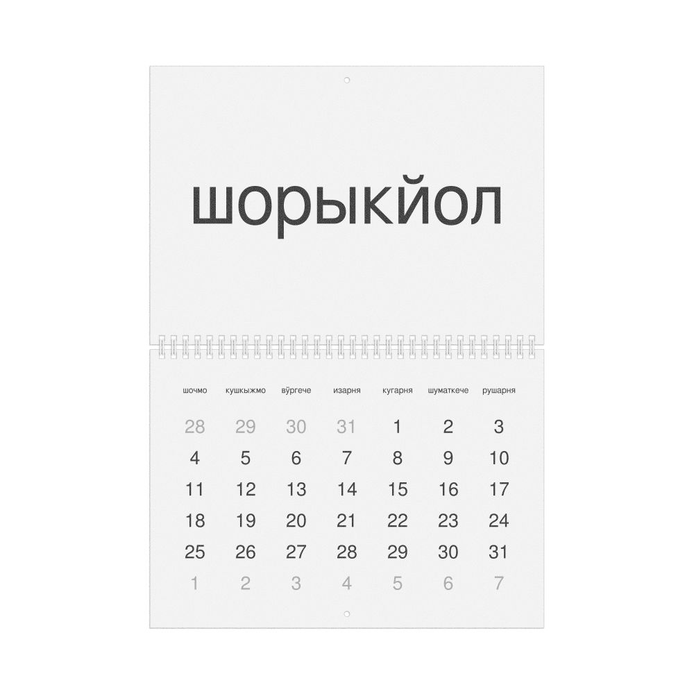 • Mari heritage speakers and cultural connectors - For individuals seeking to maintain a connection to their history, ancestral roots, or the culture associated with the Mari language, the calendar serves as a daily cultural marker. Use it in your home, office, library, or museum as a link to linguistic and cultural identity that integrates Mari into your everyday life. Familiar language script and naming conventions may also provide a sense of home in a foreign environment.