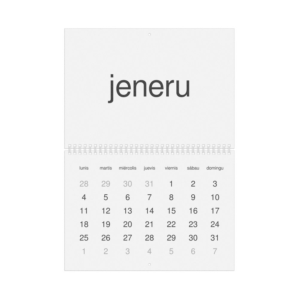 This calendar features the Extremaduran names of months and days of the week on top of a standard Gregorian calendar layout. Beyond its utility for tracking dates, it serves as an educational tool, cultural touchstone (cultural artifact), and functional decor (aesthetic object).
