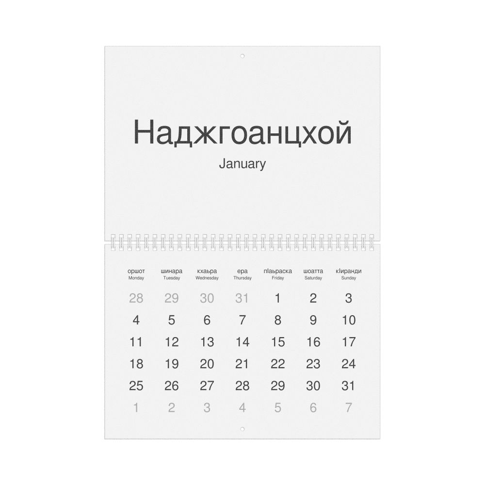 2026 Wall Calendar, Ingush/English-Labeled, Sunday-Start Layout, Wire-Bound, 11.7 x 8.3 in (29.7 x 21.0 cm)