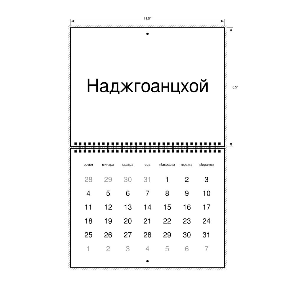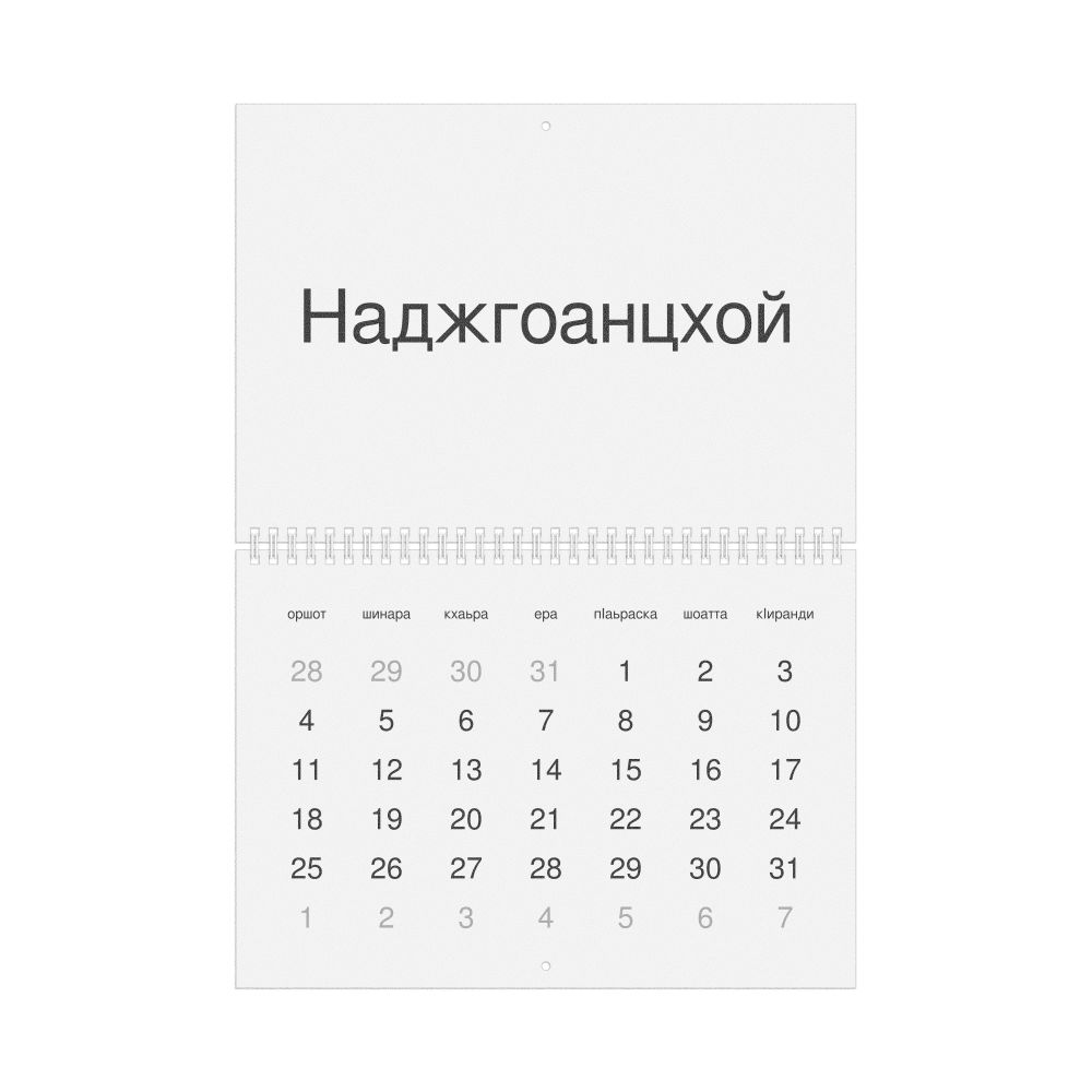 • Linguistics enthusiasts and polyglots - For "language geeks" interested in comparative linguistics or the mechanics of different languages and who value the aesthetic differences in scripts, orthography, and typography of different languages, the Ingush calendar serves as an object of intellectual interest. You can collect calendars for various languages to compare their linguistic roots (e.g., comparing Romance languages vs. Slavic languages). Leskoff's calendars are characterized by specific typographic choices that highlight the orthography and script unique to the target language. Think correct usage of diacritics, characters, and directional writing (left-to-right vs. right-to-left). The minimalist design focuses on legibility and aesthetic appeal of the script itself.