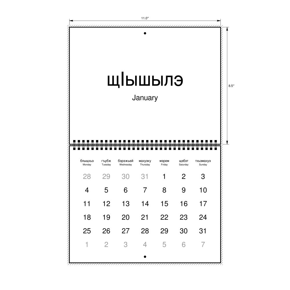 2026 Wall Calendar, Kabardian/English-Labeled, Monday-Start Layout, Wire-Bound, 11 x 8.5 in (27.9 x 21.6 cm)