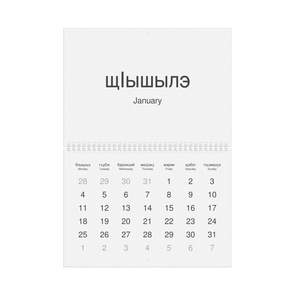 2026 Wall Calendar, Kabardian-Labeled, Monday-Start Layout, Poster / Wall Print, 23.4 x 33.1 in (59.4 x 84.1 cm)