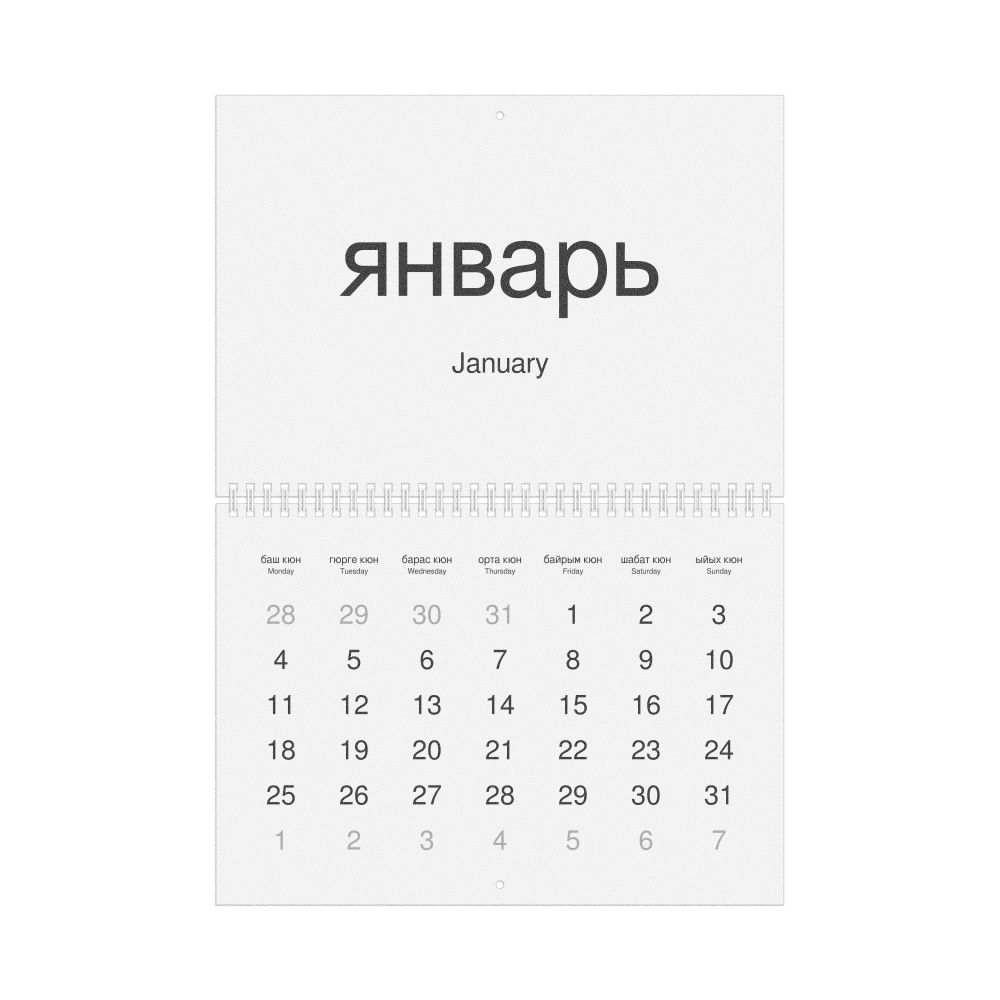2027 Wall Calendar, Karachay–Balkar/English-Labeled, Sunday-Start Layout, Wire-Bound, 11.7 x 8.3 in (29.7 x 21.0 cm)