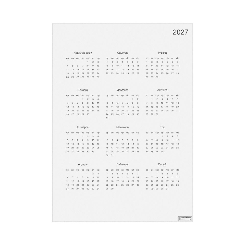 - Linguistics enthusiasts and polyglots - For "language geeks" interested in comparative linguistics or the mechanics of different languages and who value the aesthetic differences in scripts, orthography, and typography of different languages, the Ingush calendar serves as an object of intellectual interest. You can collect calendars for various languages to compare their linguistic roots (e.g., comparing Romance languages vs. Slavic languages). Leskoff's calendars are characterized by specific typographic choices that highlight the orthography and script unique to the target language. Think correct usage of diacritics, characters, and directional writing (left-to-right vs. right-to-left). The minimalist design focuses on legibility and aesthetic appeal of the script itself.