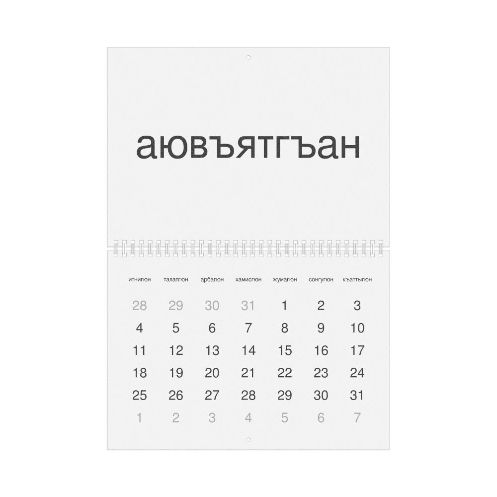 - Linguistics enthusiasts and polyglots - For "language geeks" interested in comparative linguistics or the mechanics of different languages and who value the aesthetic differences in scripts, orthography, and typography of different languages, the Kumyk calendar serves as an object of intellectual interest. You can collect calendars for various languages to compare their linguistic roots (e.g., comparing Romance languages vs. Slavic languages). Leskoff's calendars are characterized by specific typographic choices that highlight the orthography and script unique to the target language. Think correct usage of diacritics, characters, and directional writing (left-to-right vs. right-to-left). The minimalist design focuses on legibility and aesthetic appeal of the script itself.