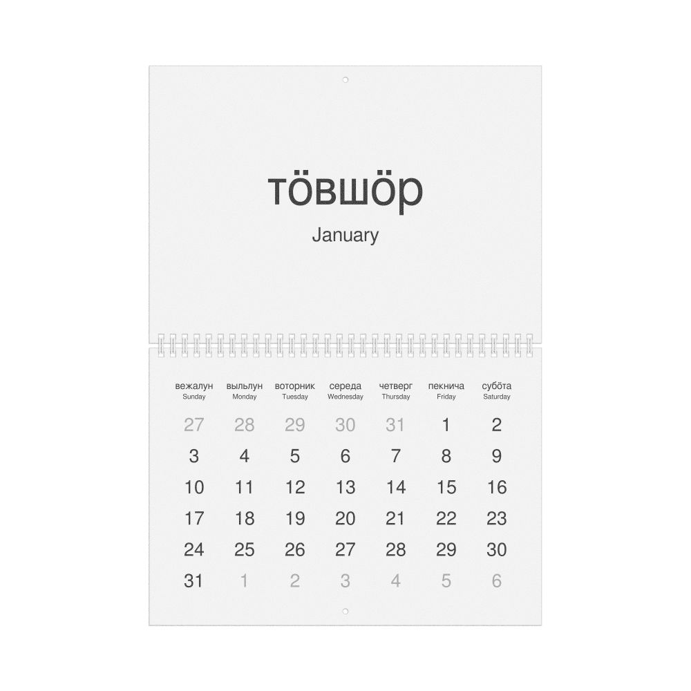 A Komi-language wall calendar (2027, Sunday-start format) with English translations.