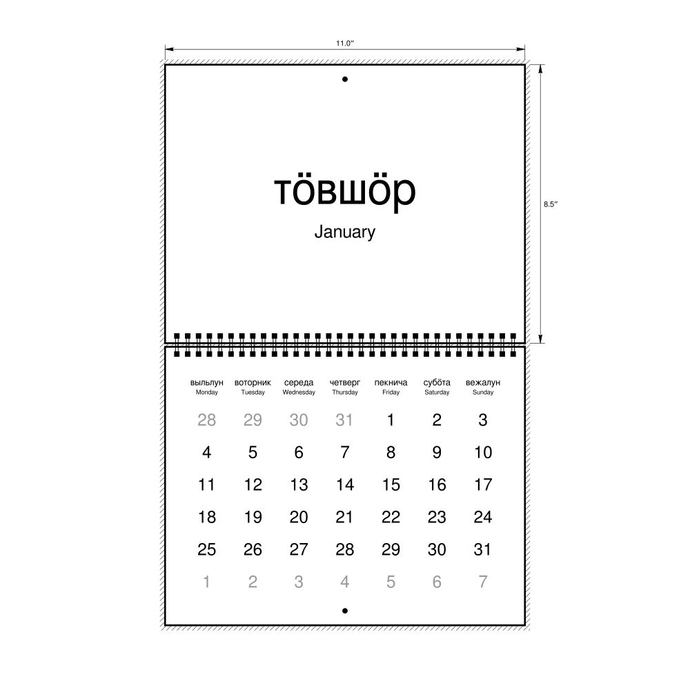 2027 Wall Calendar, Komi/English-Labeled, Sunday-Start Layout, Wire-Bound, 11 x 8.5 in (27.9 x 21.6 cm)