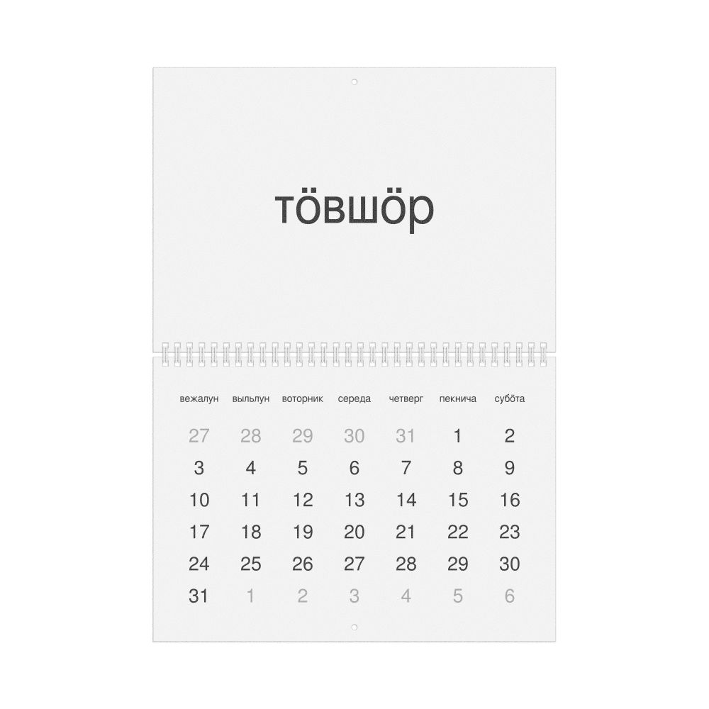 • Linguistics enthusiasts and polyglots - For "language geeks" interested in comparative linguistics or the mechanics of different languages and who value the aesthetic differences in scripts, orthography, and typography of different languages, the Komi calendar serves as an object of intellectual interest. You can collect calendars for various languages to compare their linguistic roots (e.g., comparing Romance languages vs. Slavic languages). Leskoff's calendars are characterized by specific typographic choices that highlight the orthography and script unique to the target language. Think correct usage of diacritics, characters, and directional writing (left-to-right vs. right-to-left). The minimalist design focuses on legibility and aesthetic appeal of the script itself.