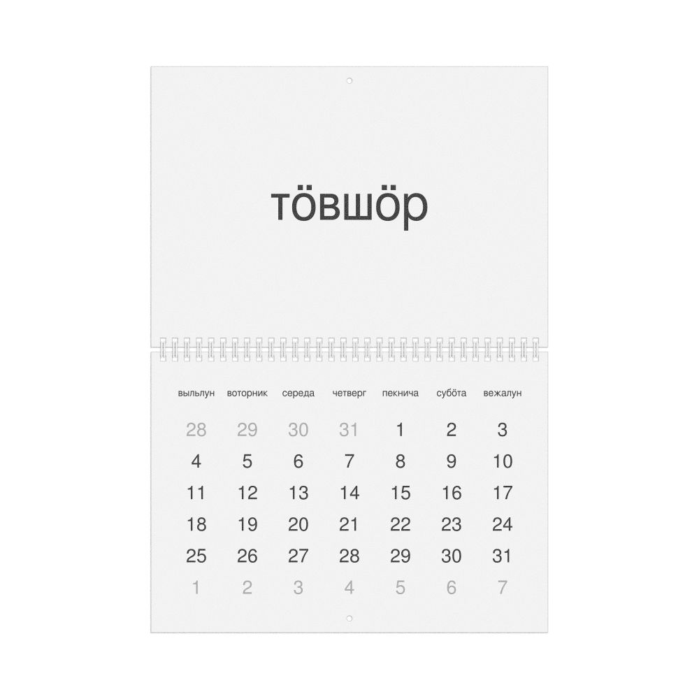 • Linguistics enthusiasts and polyglots - For "language geeks" interested in comparative linguistics or the mechanics of different languages and who value the aesthetic differences in scripts, orthography, and typography of different languages, the Komi calendar serves as an object of intellectual interest. You can collect calendars for various languages to compare their linguistic roots (e.g., comparing Romance languages vs. Slavic languages). Leskoff's calendars are characterized by specific typographic choices that highlight the orthography and script unique to the target language. Think correct usage of diacritics, characters, and directional writing (left-to-right vs. right-to-left). The minimalist design focuses on legibility and aesthetic appeal of the script itself.