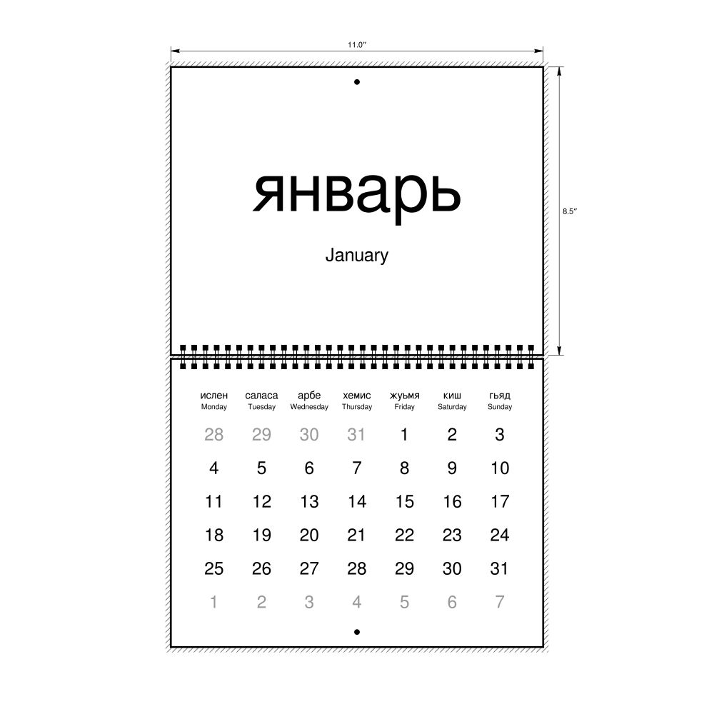 2026 Wall Calendar, Lezgian/English-Labeled, Sunday-Start Layout, Wire-Bound, 11 x 8.5 in (27.9 x 21.6 cm)