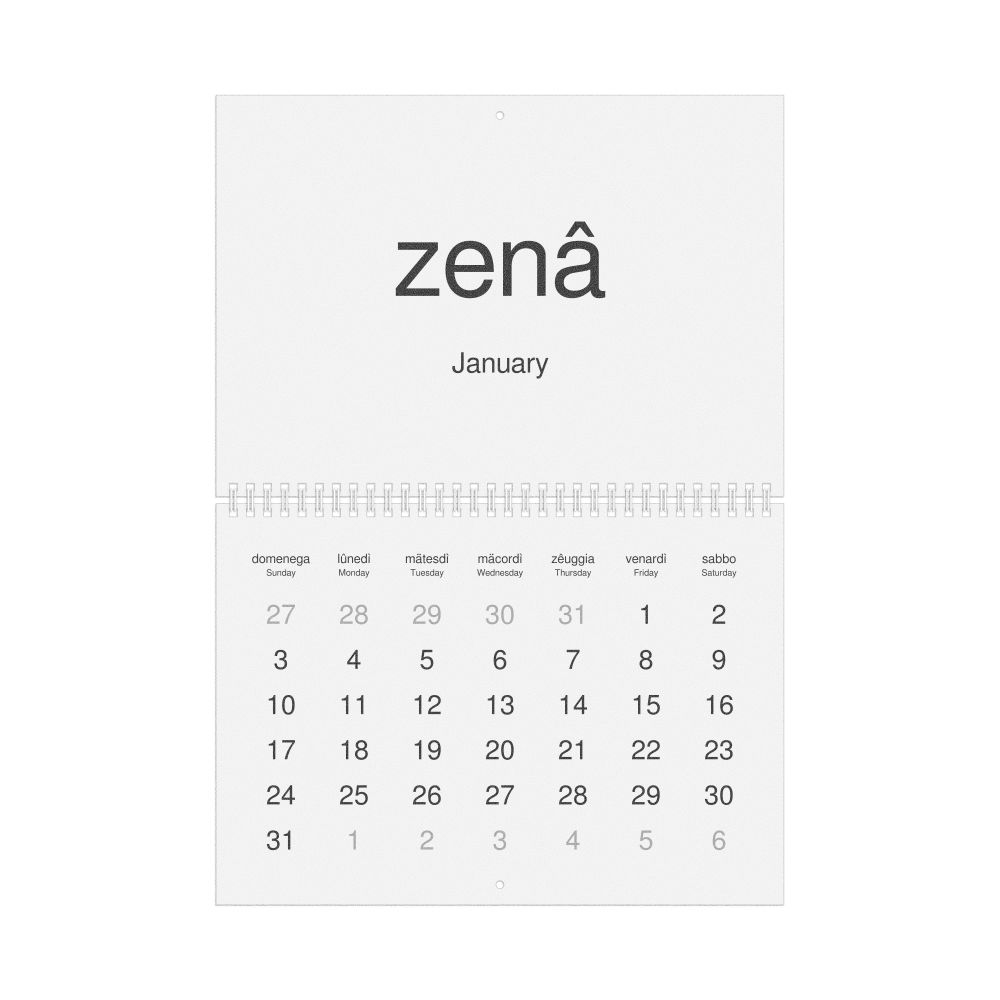 A Ligurian-language wall calendar (2027, Sunday-start format) with English translations.