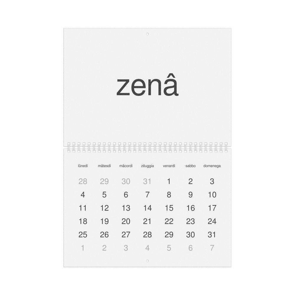 - Ligurian heritage speakers and cultural connectors - For individuals seeking to maintain a connection to their history, ancestral roots, or the culture associated with the Ligurian language, the calendar serves as a daily cultural marker. Use it in your home, office, library, or museum as a link to linguistic and cultural identity that integrates Ligurian into your everyday life. Familiar language script and naming conventions may also provide a sense of home in a foreign environment.