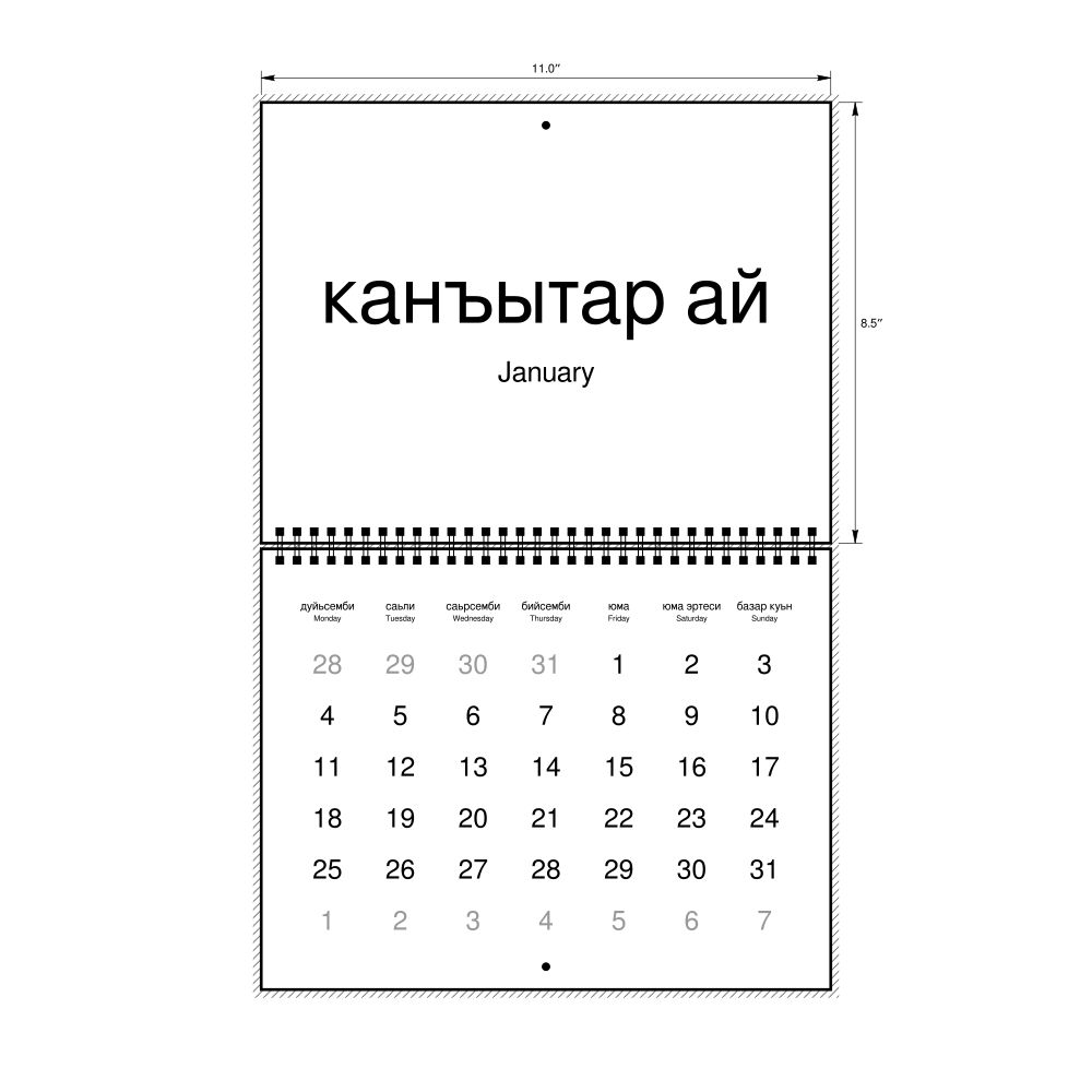 2027 Wall CalendarNogai/English-Labeled, Monday-Start Layout, Wire-Bound, 11 x 8.5 in (27.9 x 21.6 cm)
