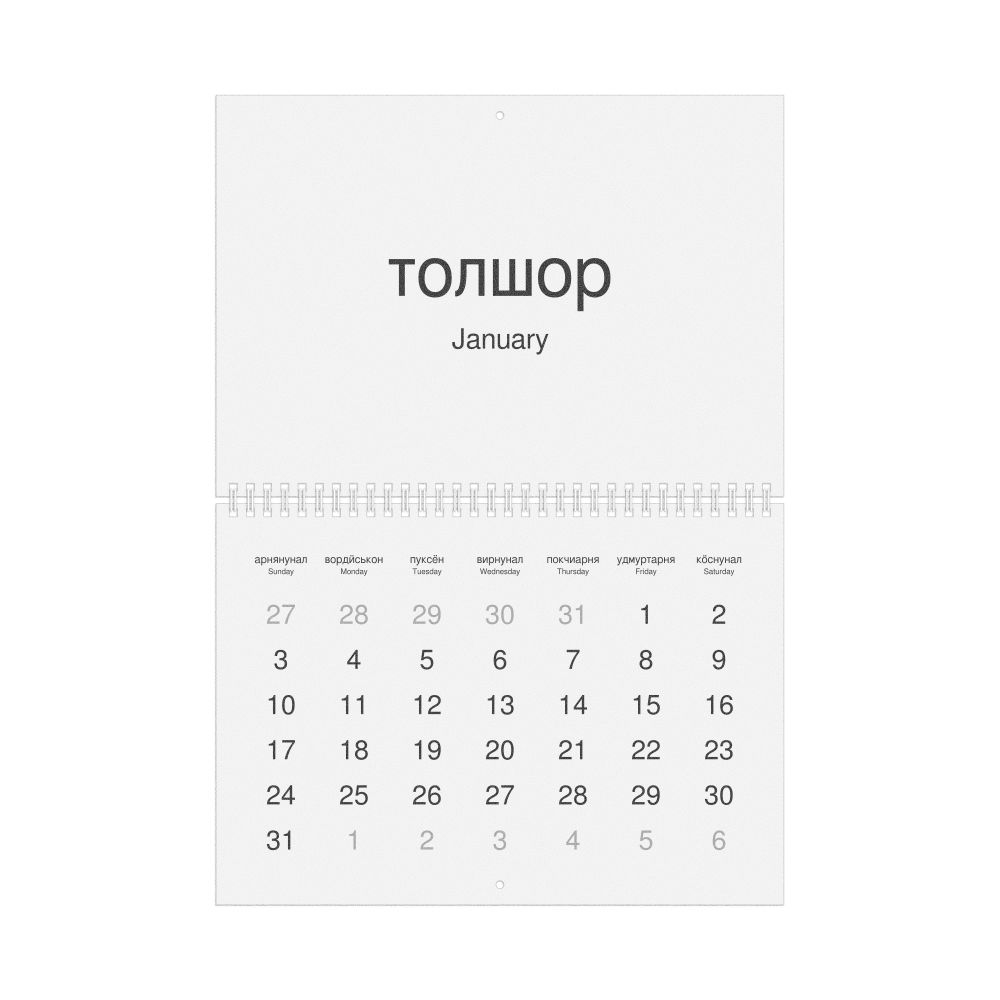 2026 Wall Calendar, Udmurt-Labeled, Sunday-Start Layout, Wire-Bound, 11.7 x 8.3 in (29.7 x 21.0 cm)