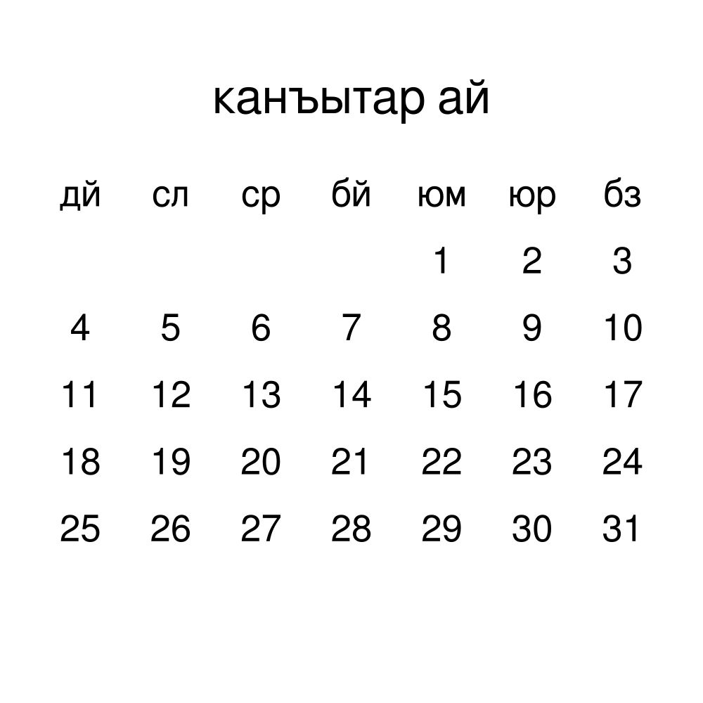 This calendar features the Nogai names of months and days of the week on top of a standard Gregorian calendar layout. Beyond its utility for tracking dates, it serves as an educational tool, cultural touchstone (cultural artifact), and functional decor (aesthetic object).