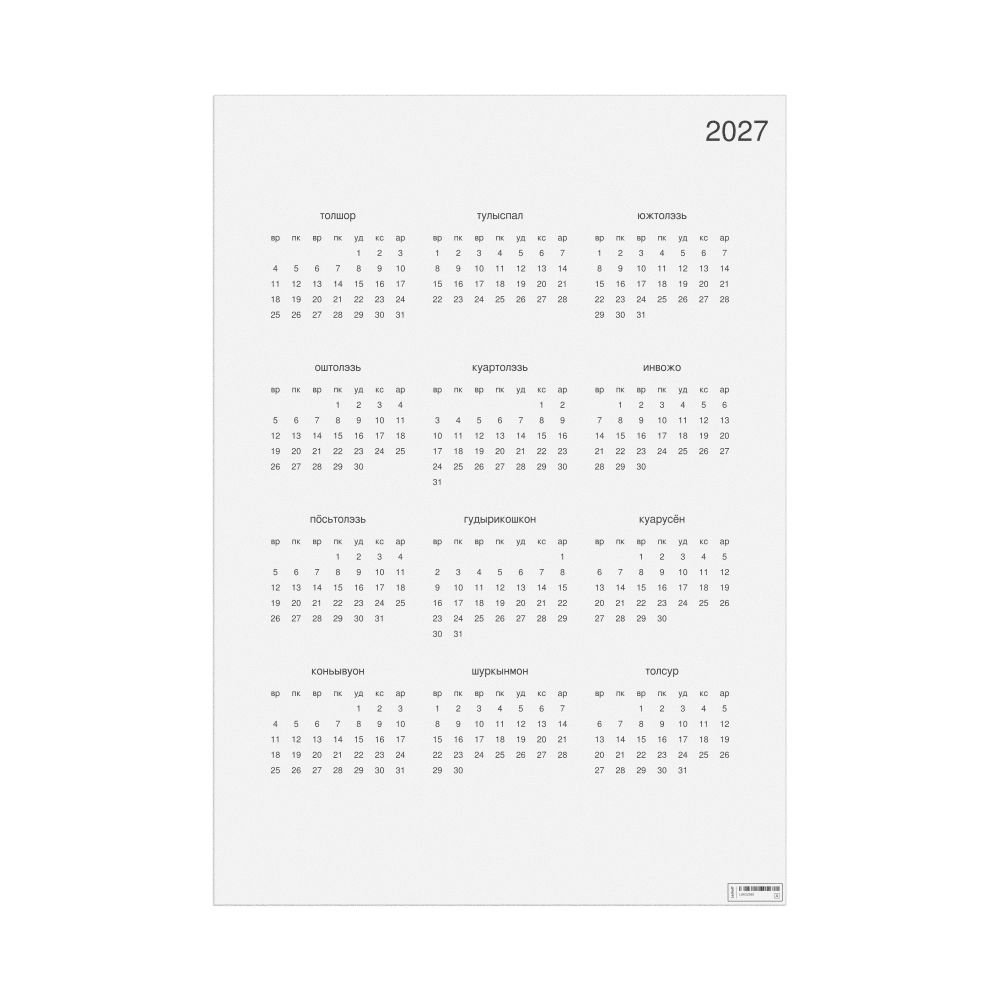 Leskoff 2027 Wall Calendar, Udmurt-Labeled, Monday-Start Layout, Poster / Wall Print, 23.4 x 33.1 in (59.4 x 84.1 cm), image 1 of 1