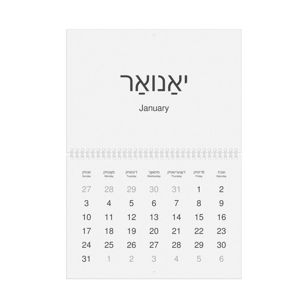 2026 Wall Calendar, Yiddish/English-Labeled, Sunday-Start Layout, Wire-Bound, 11.7 x 8.3 in (29.7 x 21.0 cm)
