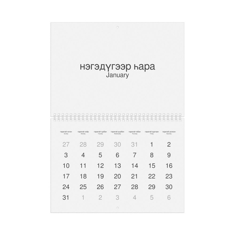2026 Wall Calendar, Buryat/English-Labeled, Sunday-Start Layout, Wire-Bound, 11.7 x 8.3 in (29.7 x 21.0 cm)