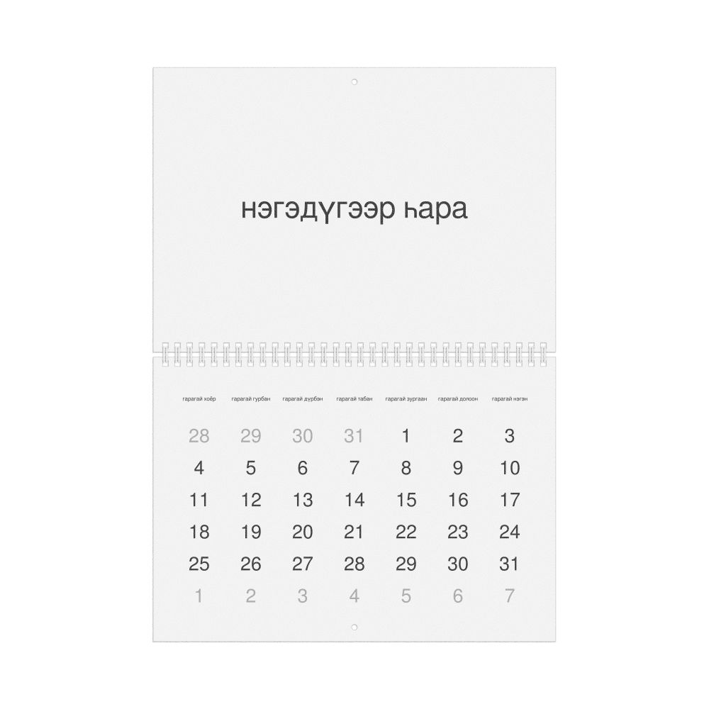 - Linguistics enthusiasts and polyglots - For "language geeks" interested in comparative linguistics or the mechanics of different languages and who value the aesthetic differences in scripts, orthography, and typography of different languages, the Buryat calendar serves as an object of intellectual interest. You can collect calendars for various languages to compare their linguistic roots (e.g., comparing Romance languages vs. Slavic languages). Leskoff's calendars are characterized by specific typographic choices that highlight the orthography and script unique to the target language. Think correct usage of diacritics, characters, and directional writing (left-to-right vs. right-to-left). The minimalist design focuses on legibility and aesthetic appeal of the script itself.